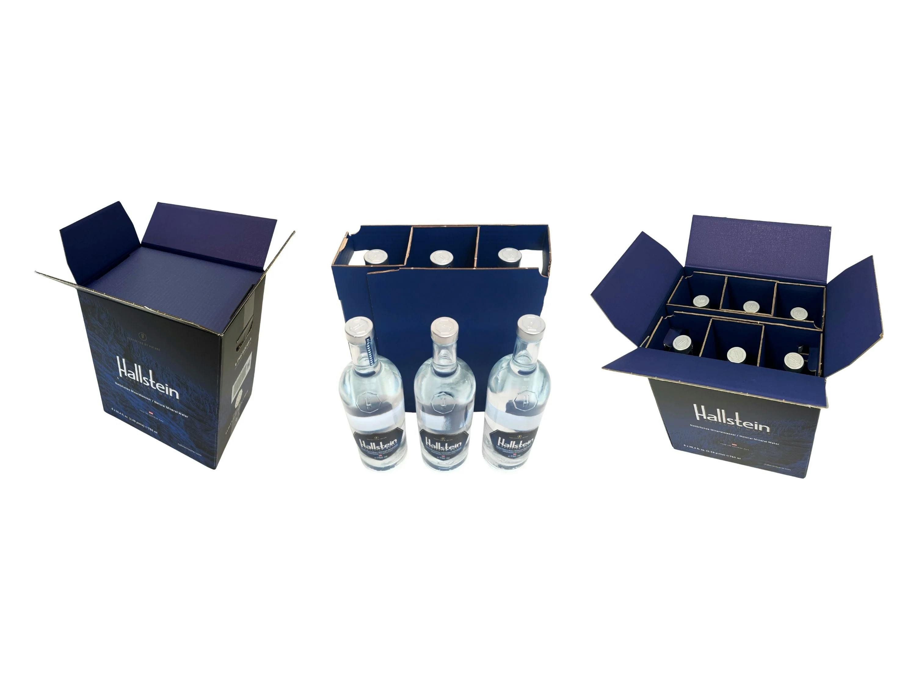 Ultimately, end consumers also benefit from the new innovative packaging solution. The Hallstein transport box can be easily folded and conveniently recycled in household waste systems. The elegantly blue-designed outer packaging highlights the Hallstein brand and underscores the premium quality of the contents. “The new transport boxes provide ample space for our branding and give the product an appealing look. This allows our customers to immediately recognize the product and its sustainability features,” adds Muhr.